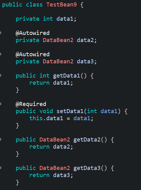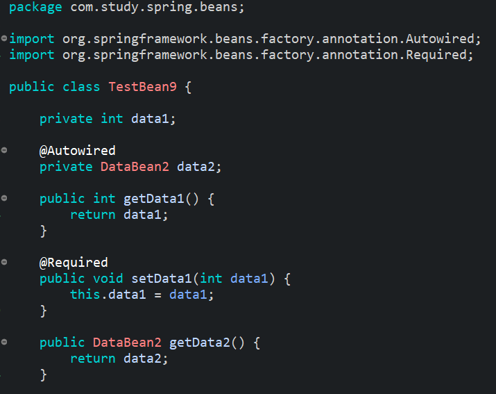 TestBean9을 재활용했다. DataBean2 타입의 data2를 추가하였는데, @Autowired로 설정해주고 getter 메소드만 만들어주었다. setter메소드는 어노테이션을 써줌으로서 자동으로 생성되기 때문이다.