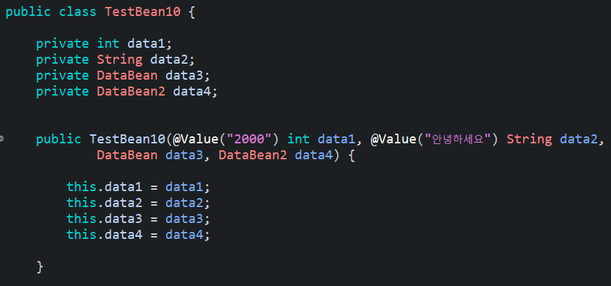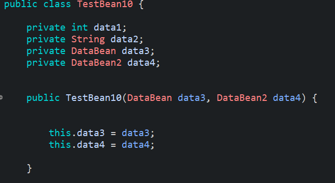 TestBean10을 다음과 같이 구성하였다. 생성자에는 매개변수로 DataBean와 DataBean2 형태인 변수를 받는다.