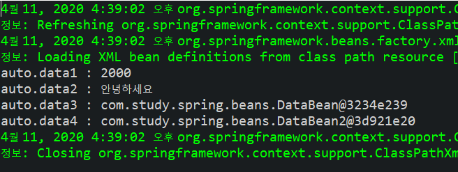 그리고 다음과 같이 getBean한 후, 그 빈의 getData2해서 DataBean2형태의 빈이 자동으로 잘 주입되었는가 출력을 해보았다.