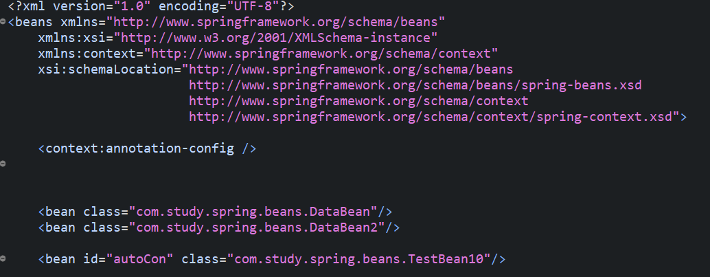 1번 예제에서 처럼 xml파일에 어노테이션을 이용한 빈을 등록하기 위해서는 <context:annotation-config/> 을 포함하여 xml파일의 속성을 조금 바꾸어 주어야 한다고 설명하였다.