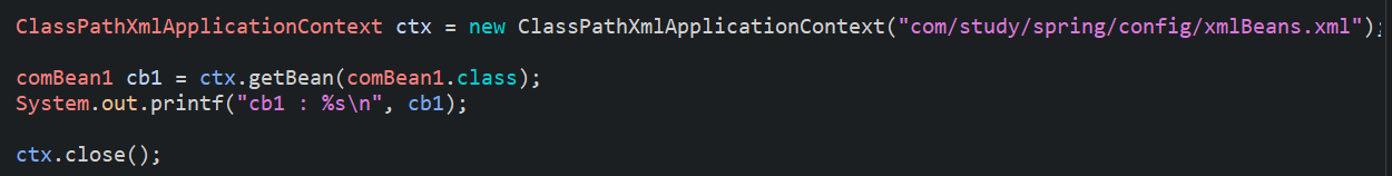 getBean하여 객체를 가져오기 전에 comBean1클래스의 기본생성자가 호출된 모습을 볼 수 었다.