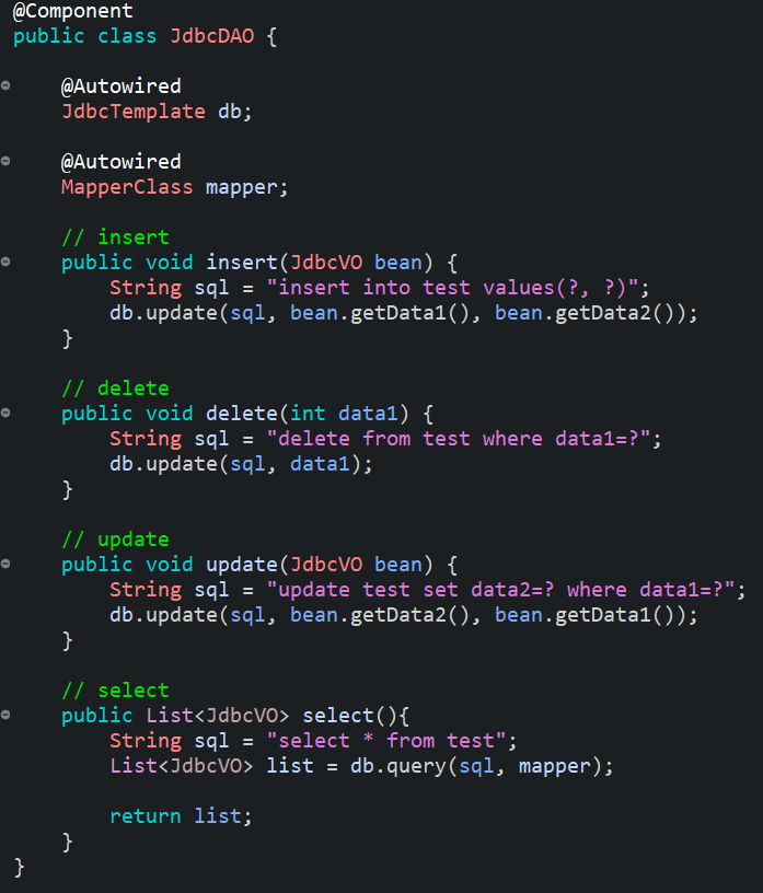 아까 말한것 처럼 Row가 여러개면 List의 형태로 담아서 활용한다. JdbcVO를 제네릭으로 받는 List형태의 select메소드를 만들었다. select는 다른 작업과 다르게 update()가 아닌 query()를 사용한다.
