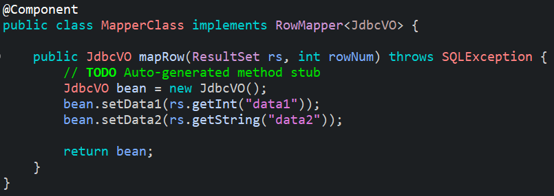 MapperClass를 다음과 같이 정의하였다. MapperClass는 SpringFramework에서 제공하는 RowMapper<T>인터페이스를 구현하여 작성한다. mapRow라는 메소드를 오버라이딩하여 작성한다. VO 객체를 만들어서 그 객체의 setter를 이용하여 데이터를 담아주었다.