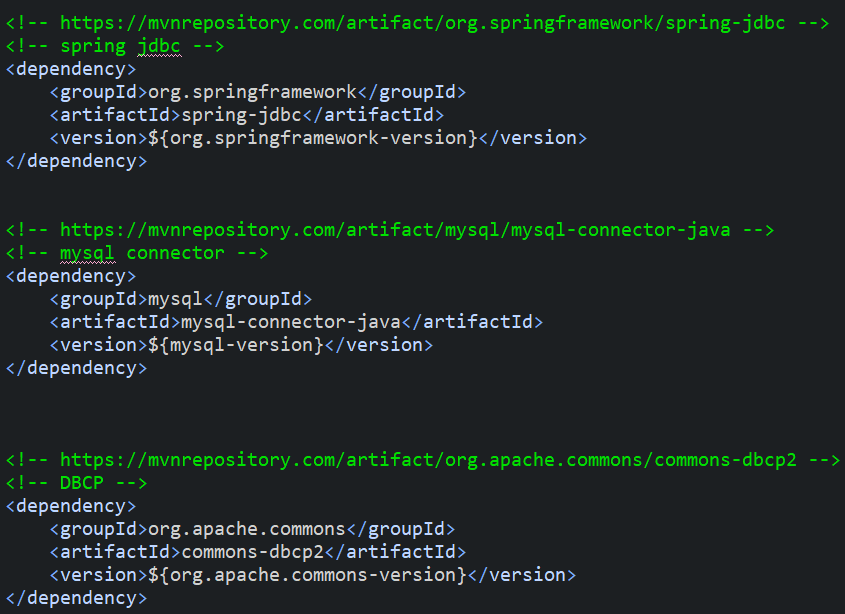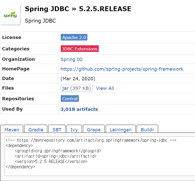mvnrepository에서 Spring JDBC를 검색하여 Maven코드를 추가해주었다. Spring버전과 일치하는 라이브러리를 사용하는것이 좋다. Spring버전과 일치하는 5.2.5 버전을 사용하였다.