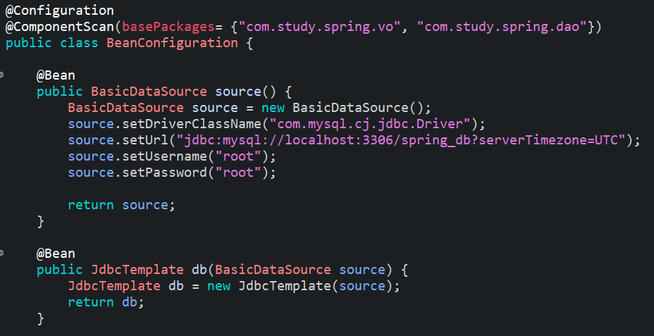 이 클래스는 위에서 추가해준 라이브러리의 jdbc패키지에 있는 클래스이다. 위에서 만든 source메소드를 매개변수로 받아준다. 위와같이 BasicDataSource source로 매개변수를 받으면 빈으로 등록되어 있던 source메소드가 자동으로 매개변수로 들어가게 된다. 그 후, JdbcTemplate 클래스 변수를 만들어서 리턴해준다.