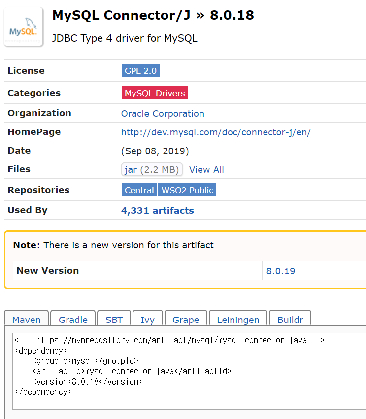Spring에서 우리는 Maven을 사용하기 때문에 아주 간편하게 의존성만 추가해주면 커넥터를 사용할 수 있다.