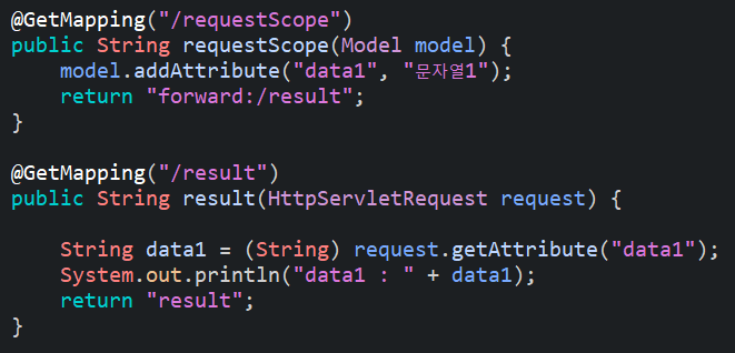 Model을 사용하는 방법도 크게 다르지 않다. 다만 Model을 사용하여 포워딩을 했는데 받는 result메소드에서는 왜 Model로 받지 않고 HttpServletRequest를 이용하여 받았는지 의문이 들 수 있다.