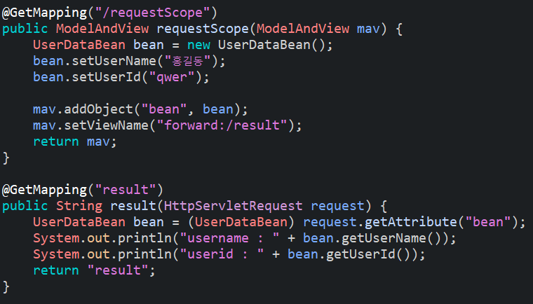 예를 들어, forward는 새로운 요청을 하는 것이 아니기 때문에(브라우저에게 새로운 요청을 하는것이 아닌 서버단에서 전달하는 것) 원래 있는 빈을 그대로 이용하게 되겠다. 다른 빈 객체가 새롭게 주입되지 않는 이상 객체는 계속 유지가 된다.