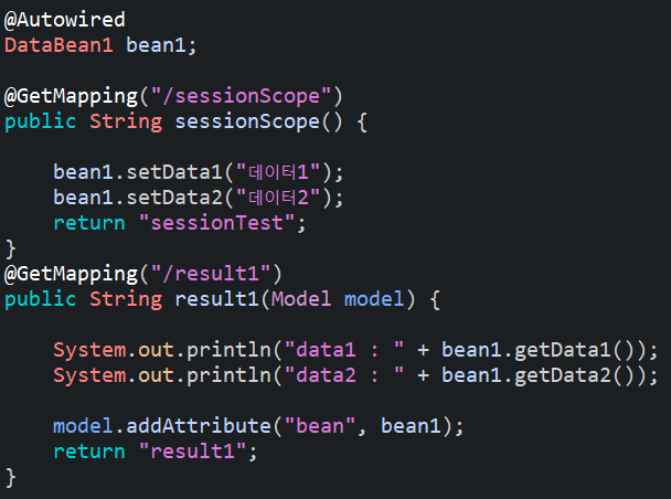 "data1"이라는 이름으로 등록되어 있는 session객체를 찾아서 DataBean1 bean에 넣어주는 것이다.
