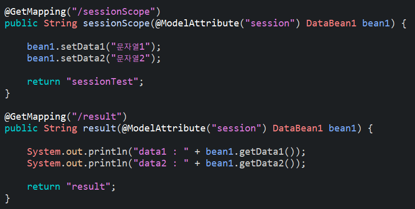 @ModelAttribute의 경우 @ModelAttribute를 통해 주입 받는 빈은 자동으로 Request영역에 저장이 되고 Request 영역으로부터 주입을 받게 된다. 이때 @ModelAttribute를 통해 주입을 받는 빈을 @SessionAttributes로 지정해주면 Request영역이 아닌 Session영역에 저장이 되고 Session영역으로부터 주입을 받을 수 있다.