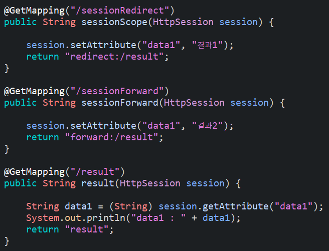 위와 같이 Redirect요청을 반환하는 메소드 한개와 Forward요청을 반환하는 메소드 한개를 각각 정의 한후 result메소드에는 session에 저장된 data1을 출력할 수 있도록 해보았다.