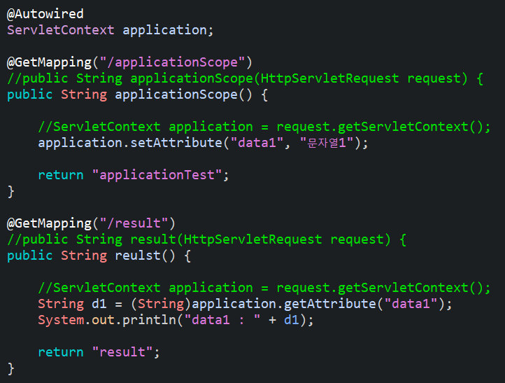 위와 같이 @Autowired로 ServletContext를 자동주입 받아 오면 매개변수로 HttpServletRequest를 받아오지 않아도 ServletContext를 이용해서 Application영역의 메모리공간을 사용할 수 있다.