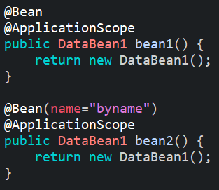 자바 빈 설정파일에 다음과 같이 @ApplicationScope를 사용해서 빈을 2개 정의해주었다. 위의 bean1메소드는 타입을 통한 빈 주입에 사용될 것이고 bean2메소드는 이름을 통한 빈 주입에 사용될 것이다.