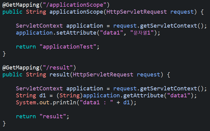 ServletContext는 HttpServletRequest에서 받아올 수 있다. 위와 같이 ServletContext형 변수를 만들어서 받아온 후에 사용할 수 있다. Request영역이나 Session영역과 크게 다를바는 없다. ServletContext를 사용한다는것만 알아두도록 하자.