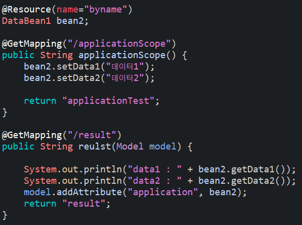각각 타입을 통한 주입과 이름을 통한 주입이다. 위에서 설명하였듯, Application영역에 직접 주입되는 것이 아니기 때문에 View단에서 사용하려면 Model을 사용하여 현재 빈을 Request영역에 넣어서 보내주어야 한다.