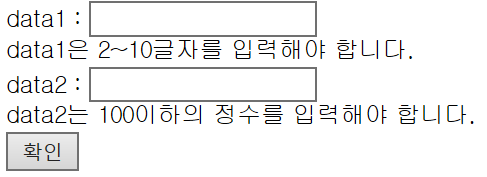 DataBean1빈에서 data1프로퍼티의 Size(여기서는 2~10글자수의 문자열)에 유효성검사가 실패하면 오류가 날것이기 때문에 오류메세지를 위와 같이 정의해준다. data2도 마찬가지이다.