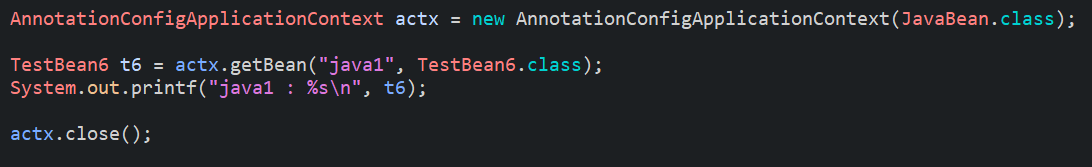AnnotationConfigApplicationContext를 사용하여 자바클래스를 불러온다. xml파일은 해당파일의 path를 다 적어주어야 하지만 자바클래스는 위와같이 JavaBean.class와 같이 적어주면 된다.