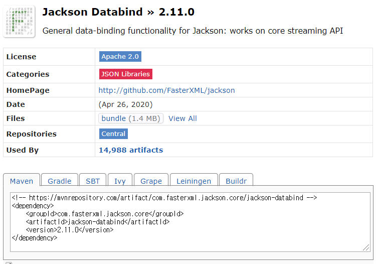 Jackson Databind라고 검색하여 Maven부분을 추가해주도록 하자.