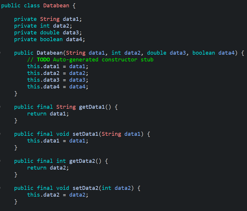 DataBean이라는 빈클래스를 만들었다. 어떠한 형태이든 JSON으로 변환됨을 확인하기 위해서 String, int, double, boolean형의 프로퍼티 총 4개를 만들었다. 간단하게 값을 넣을 수 있도록 생성자를 통해서 주입이 가능하도록 만들어 보았다.