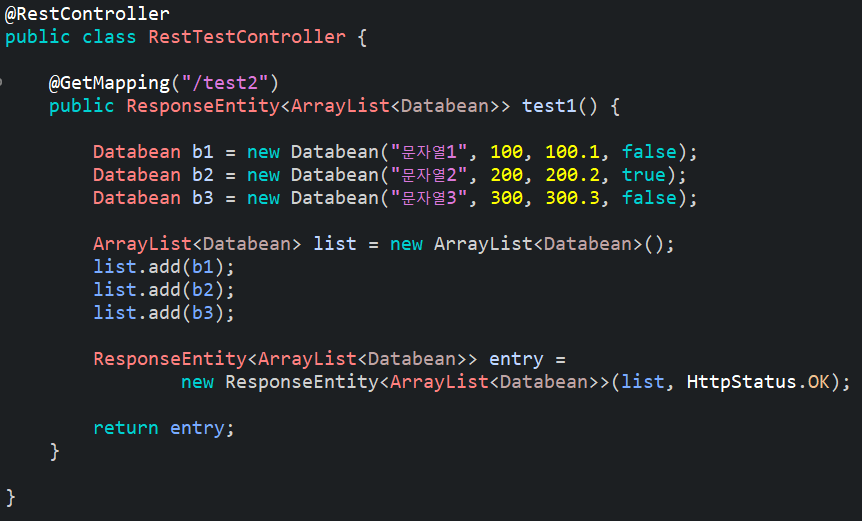 ResponseEntity<T>의 제네릭에 ArrayList<Databean>을 넣어주면 리스트안에 들어있는 객체의 구조를 파악해서 JSON문서로 만들어주게 된다. JSON객체를 첫번째 매개변수에, 응답결과를 두번째 매개변수에 넣어주었다.