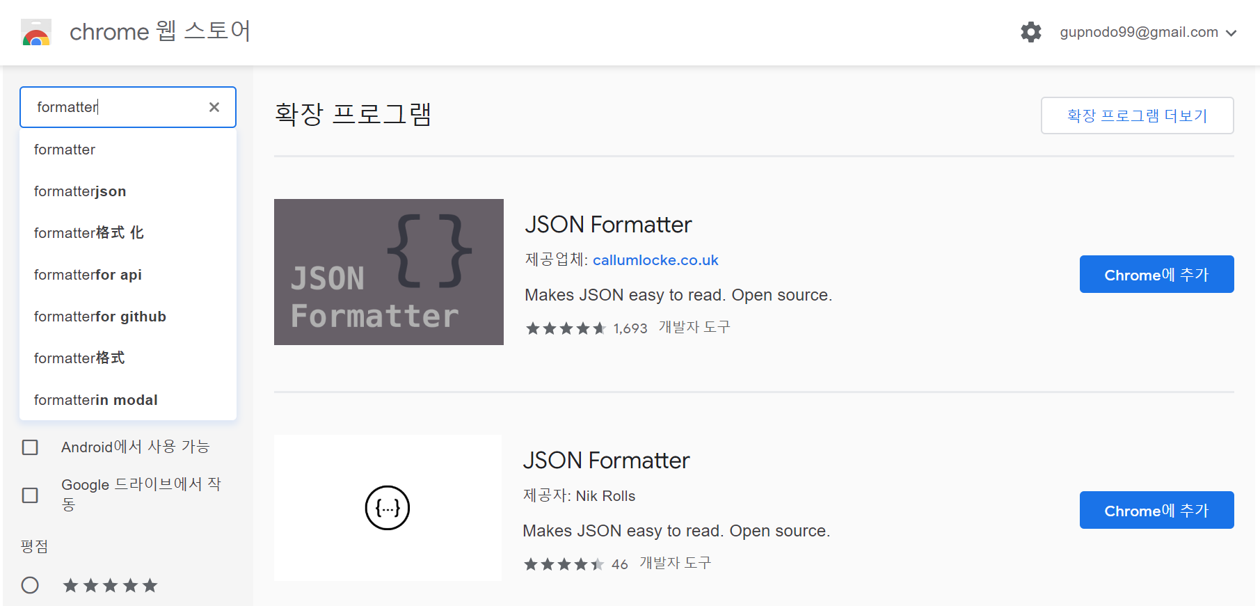 한눈에 JSON형식을 보려면 Chrom 웹 스토어에서 JSON Formatter를 설치하면 된다.