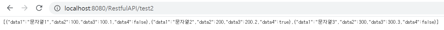 ResponseEntity<T>의 제네릭에 ArrayList<Databean>을 넣어주면 리스트안에 들어있는 객체의 구조를 파악해서 JSON문서로 만들어주게 된다. JSON객체를 첫번째 매개변수에, 응답결과를 두번째 매개변수에 넣어주었다.