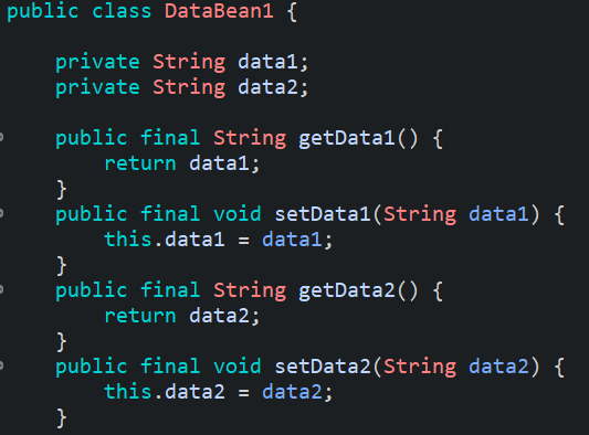 우선, 빈으로 사용될 VO클래스를 만들어주자. userName, userId, userPassword, userAddr1, userAddr2로 구성되어 있다.