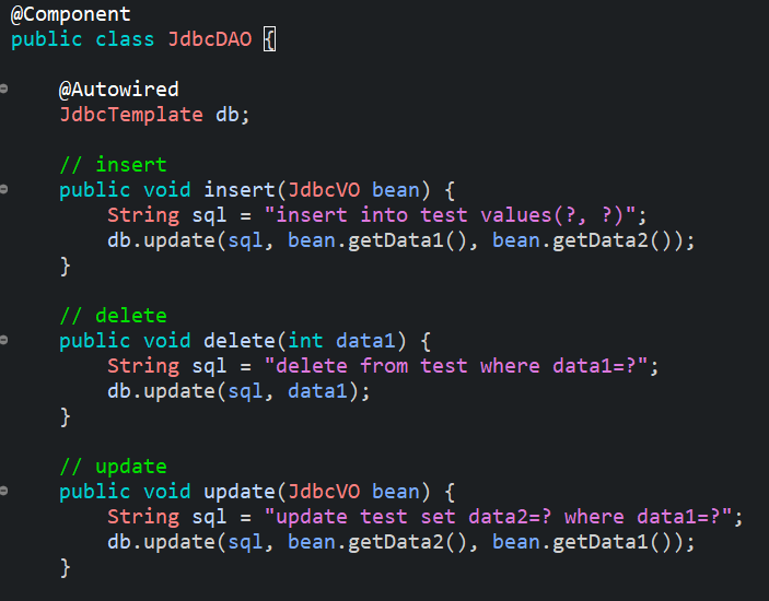 Spring JDBC에서는 Java에서 사용했던 방식과 똑같이 ?을 넣어 쿼리문을 선언해주고, update()메소드 매개변수에 순서를 맞추어 줌으로써 ?에 값이 1:1대응으로 삽입이 되게 만들어 주었다.