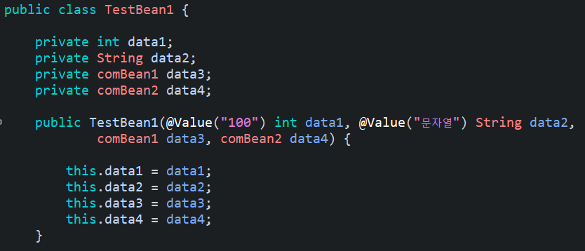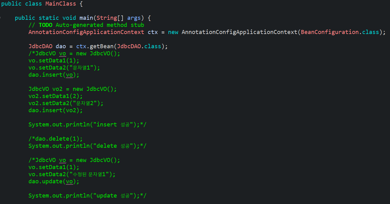 주석처리된 구문의 의미는 '데이터베이스의 data1 칼럼에는 지정된 빈의 data1 프로퍼티에 넣겠다', '데이터베이스의 data2 칼럼에는 지정된 빈의 data2 프로퍼티에 넣겠다' 의 의미가 된다.