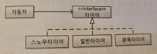 이는 추상화된 타이어 인터페이스에 자동차클래스를 의존시킴으로써 해결할 수 있다. 스노우타이어 클래스, 일반타이어 클래스, 광폭타이어 클래스는 각각 추상적인 타이어 인터페이스를 구현하는 클래스가 되었다.