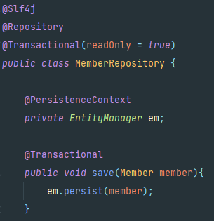 MemberRepository는 클래스 레벨에서 @Transactional 애노테이션을 readOnly = true 옵션으로 지정하여 안의 메소드를 읽기전용으로 지정을 해주었다. save는 직접 DB에 접근하기 때문에 readOnly옵션을 풀어준 @Transactional 애노테이션만 붙여준 상황이었다.
