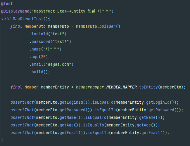 Member엔티티는 DB와 매핑되는 필드를 가지고 있기 때문에 id값이 있지만, Dto는 id필드가 없다. 그러므로 toEntity를 할때 id필드의 값이 없어서 상수로 지정해준 것이다. (id값이 없어서 Error가 날 수도 있을 것 같아서 테스트를 진행할 때 constant로 박아놓고 잘 돌아가는군. 이라고 생각했다......)