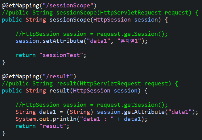 또 한가지, SpringMVC에서는 HttpSession이라는 클래스를 제공한다. 위에 주석처리 되어 있는 코드를 보면 우리는 JSP Servlet를 이용할 때에도, Request를 이용하여 데이터를 사용할 때에도 이와 같은 방법으로 request.getSession()을 통해 세션을 가지고 왔고 그 세션에 저장되어 있는 객체를 getAttribute를 이용하여 가져와서 사용하였다.