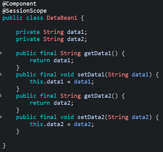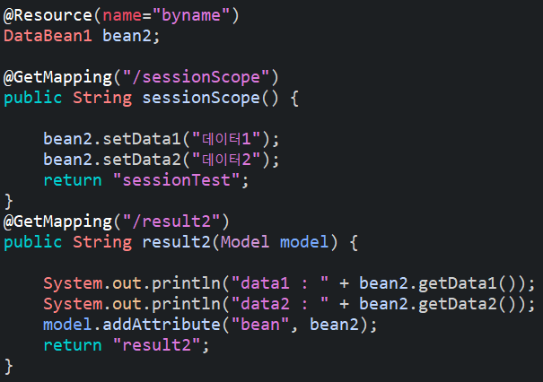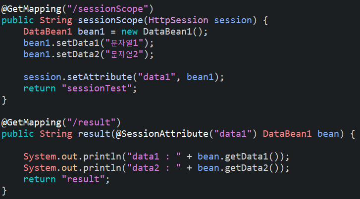 "data1"이라는 이름으로 등록되어 있는 session객체를 찾아서 DataBean1 bean에 넣어주는 것이다.