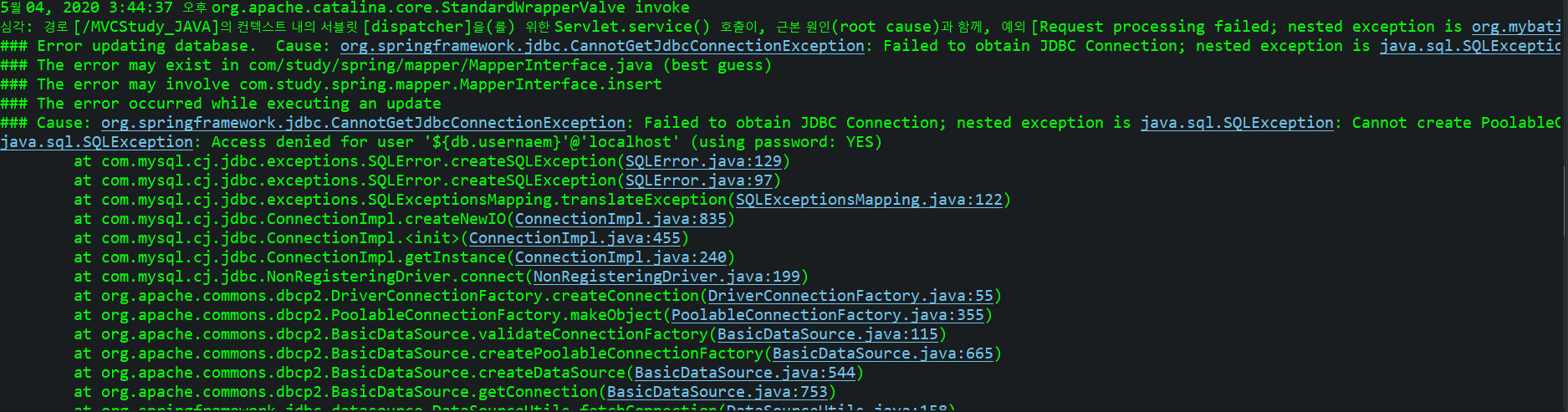심각: 경로 [/MVCStudy_JAVA]의 컨텍스트 내의 서블릿 [dispatcher]을(를) 위한 Servlet.service() 호출이, 근본 원인(root cause)과 함께, 예외 [Request processing failed; nested exception is org.mybatis.spring.MyBatisSystemException: nested exception is org.apache.ibatis.exceptions.PersistenceException: