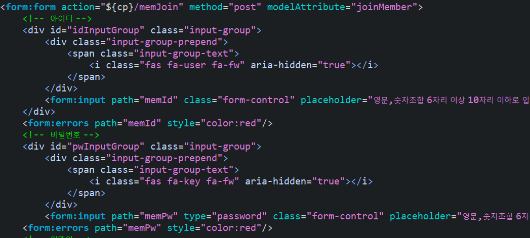 joinMember라는 이름으로 jsp로 넘겨주었다. 넘겨줄 때, ModelAttribute를 이용하여 이름을 지정해준것이다. 그 이름으로 joinForm에서 form커스텀태그의 속성에 modelAttribute를 이용해서 받아주었다.
